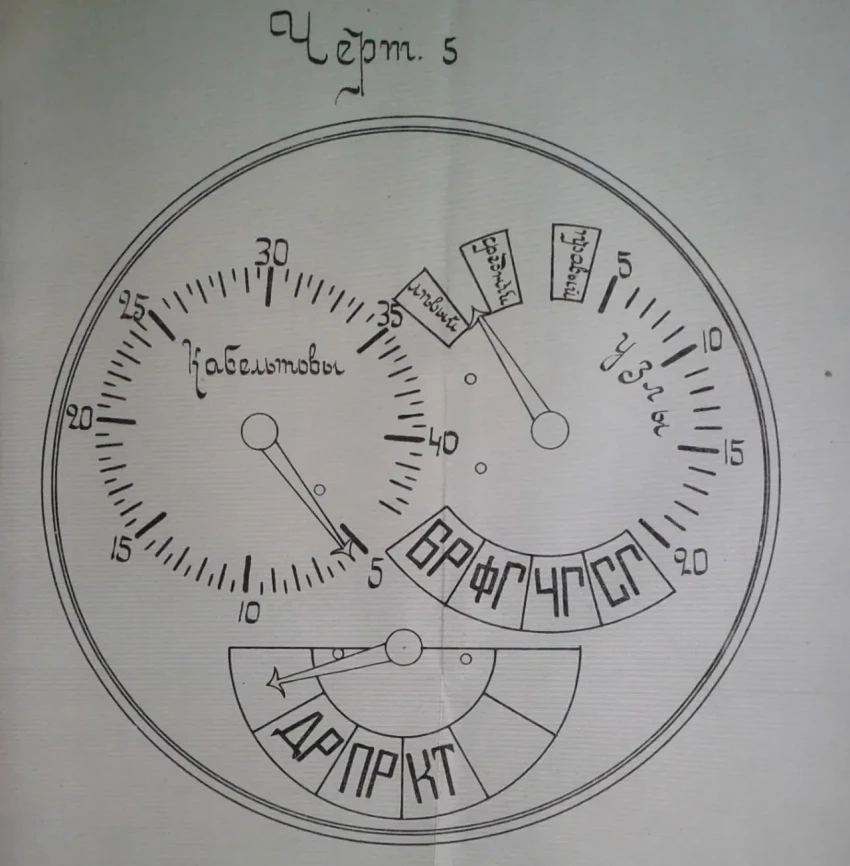 Во-вторых, эта же стрелка показывала ход броненосца с точностью до узла от 5 до 20 узлов. Конечно, «Пересвет» не мог ходить 20 узлов, но циферблат был именно таким.