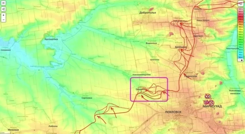 Севернее, в районе Покровска, Мирнограда и Белицкого, идут ожесточённые столкновения. За Гришино продолжаются бои, при этом часть населённого пункта остаётся в серой зоне. Если контроль над ним будет установлен полностью, это может повлиять на положение между Белицким и Сергеевкой.