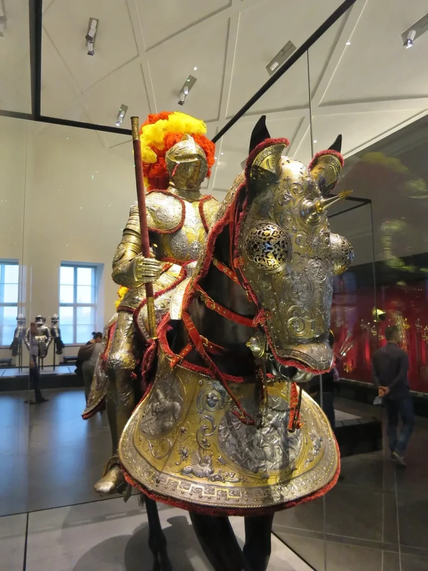 Дрезденская оружейная палата. На переднем плане групповой турнирный поединок пеших латников «с барьером». А вот позади них можно заметить сразу несколько целиком позолоченных полудоспехов. Фотография автора