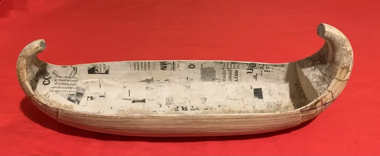 Пожалуй, можно еще одну синюю ленту повязать и на носовой завиток, а на корму поставить штандарт с изображением священного крылатого скарабея и солнечного диска – и тогда на лодке будет уже не Клеопатра, а Нефертити. Но стоит ли всё это делать, еще надо будет подумать. Равно как и решить вопрос: нужна ли сюда еще и подставка из дерева?