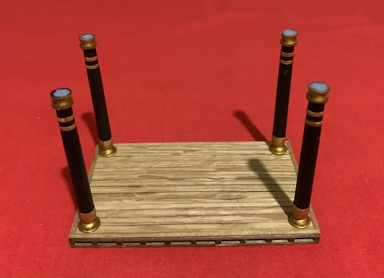 Их можно было бы выточить на токарном станке, но мне на помощь с их изготовлением пришел Игорь Фролов – основатель компании по производству сборных моделей «Фальконет», он сделал их в технологии 3D. Колонны тоже распечатаны в 3D, потому что сделать четыре одинаковые колонны сложных очертаний для «беседки» вручную было бы исключительно сложным и трудоемким делом. Даже с их раскраской пришлось порядком повозиться.