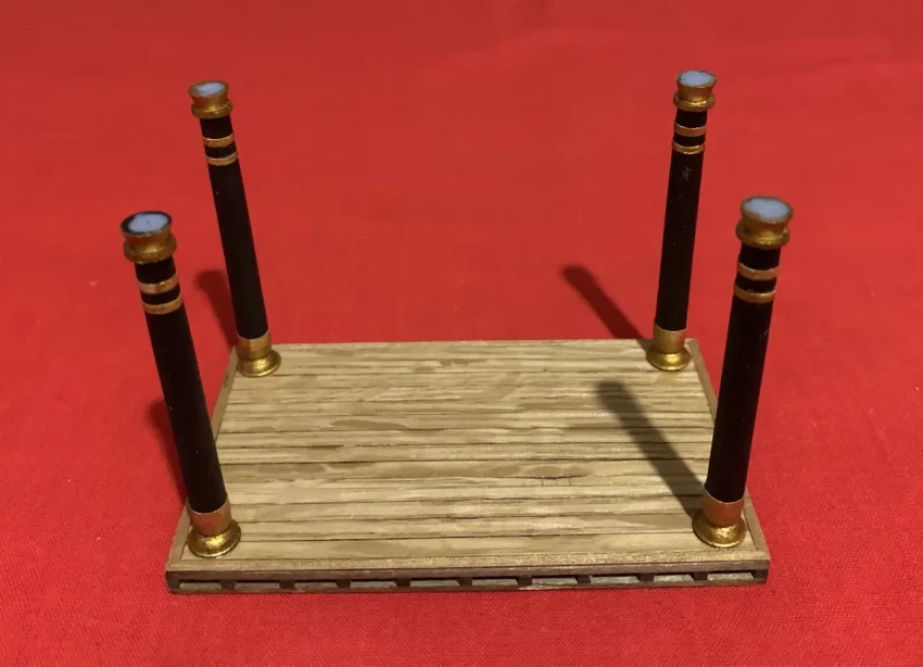 Оказалось, что цветы в корзине на палубе лодки не смотрятся, так же, как и пустой кувшин. Пришлось корзину убрать, а цветы поставить в кувшин рядом с ложем царицы. Кувшин я, кстати, сделал из ручки от засохшей кисточки, используя в качестве токарного станка обычную дрель-шуруповерт, а вот обрабатывался «кувшин» при помощи надфилей. Ручки были сделаны из толстой медной проволоки