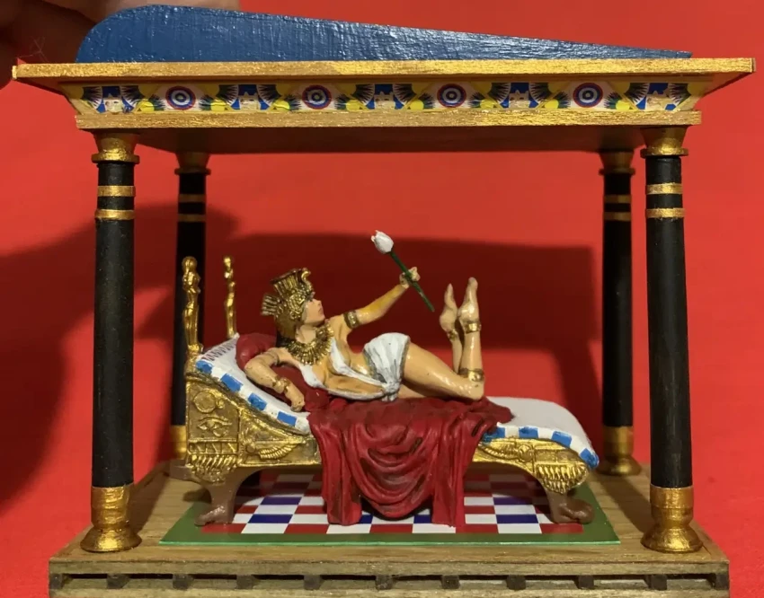 Фигурки эти были выбраны за их максимальное соответствие задуманному, однако их пришлось немного переделать. Так, воин лишался щита и копья, опахалоносцам поменяли наклон рук, рассверлили в них отверстия под весла. А еще, это уже я сам делал, пришлось поменять на них набедренные повязки на длинные «юбки» из… туалетной бумаги и японской модельной шпаклевки. У царицы Клеопатры я попросил удалить с руки змею, а также у всех фигурок подставки из-под ног убрать, заменив металлическими штырьками. Раскрашивал фигурки, понятно, я уже сам…