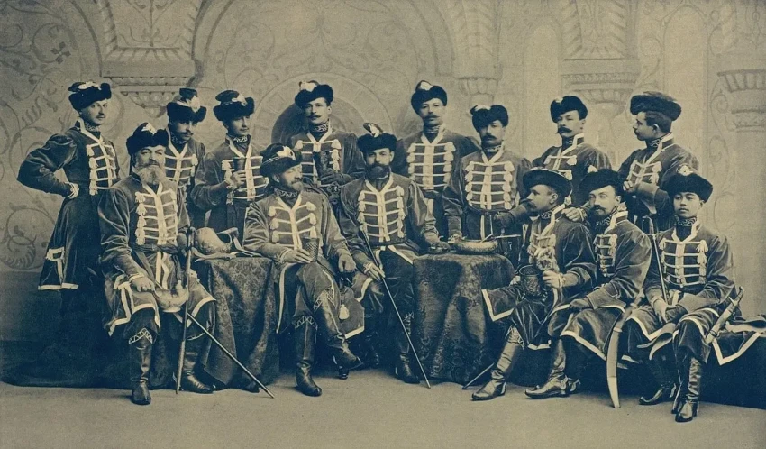 Корнет П. А. Игнатьев (стоит крайний слева) на Костюмированном балу 1903 г. в группе офицеров лейб-гвардии Гусарского Его Величества полка