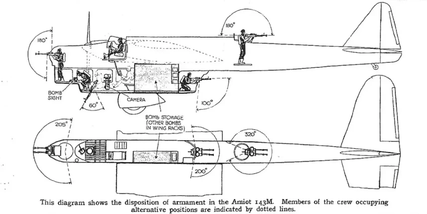 К этому времени создание машины было завершено, хотя отдельные изменения вносились в процессе серийного производства. Описание я взял из airwar.ru: Amiot 143M имел крыло из трех частей (надо полагать, что имелись в виду центроплан и консоли), каркас которого состоял из трех ферменных лонжеронов, изготовленных из труб, и нервюр в виде объемных ферм — тоже из труб. Работающая обшивка была выполнена из дюралюминиевого листа с мелким гофром. Обшивка была подкреплена изнутри профилями открытого сечения. Узкие длинные элероны занимали почти всю заднюю кромку крыла. Толщина крыла обеспечивала доступ к двигателям в полете. Фюзеляж имел незамкнутые шпангоуты, продольные стрингеры и обшивку из дюралюминиевого листа. Хвостовое оперение тоже было цельнометаллическим. Рули были отбалансированы. Угол установки горизонтального оперения можно было изменять на земле. Шасси состояло из двух отдельных узлов: основные стойки с амортизаторами крепились сверху к переднему лонжерону, а снизу соединялись с фюзеляжем подкосами каплевидного сечения.