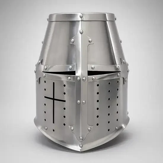 Ну, это что-то уж совсем примитивное. Зато недорого и потом на этот шлем можно прикрепить некие украшения, вырезанные из липовых ламелей и к тому же раскрасить в гербовые цвета. Потом надеваешь гербовое сюрко, под него стеганку и кольчужные совсем короткие нарукавники и… вот ты и рыцарь, ведь никто не не будет проверять – одета на тебе вся кольчуга, или же из под сюрко торчат лишь только рукава?!