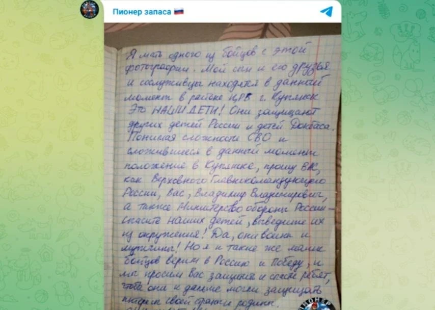 "Понимая сложности СВО и сложившееся в данный момент положение в Купянске, прошу Вас как Верховного главнокомандующего… спасите наших детей, выведите их из окружения… чтобы они и дальше могли защищать интересы своей страны и Родины. Они ждут! Мы ждём!" - написала Екатерина.