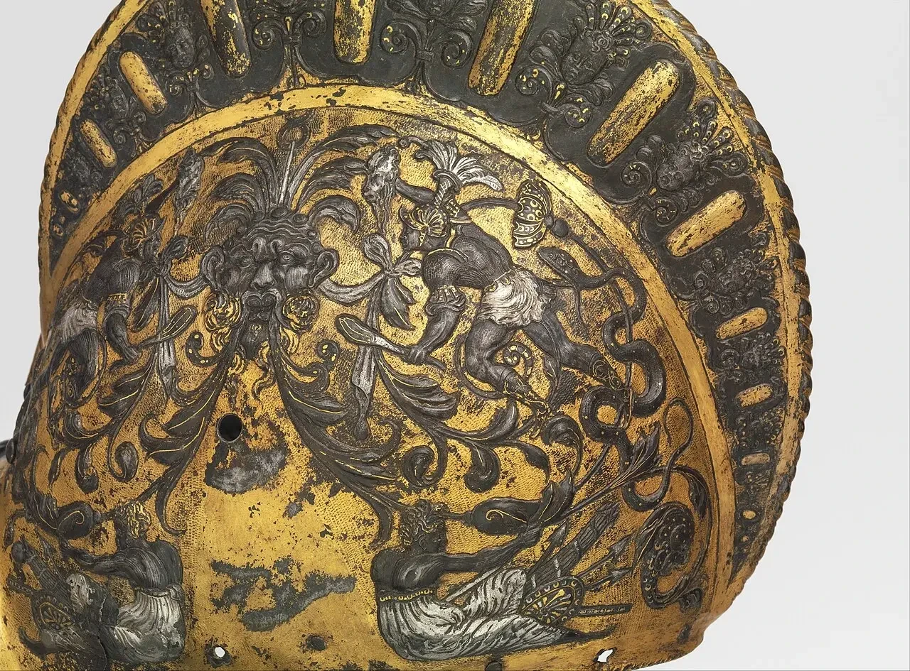 Вот и на доспехе Генриха II мы встречаем как изображения человеческих фигур, так и различные фантастические существа. Последние, по-видимому, были созданы не без влияния итальянского гротеска, в частности работ таких скульпторов, как Франческо Приматиччо и Бенвенуто Челлини, которыми для Генриха II создали целый ряд скульптур.