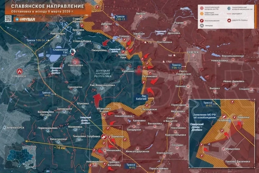 На начало марта 2026 года район Красного Лимана остается одним из самых тяжелых участков фронта на севере ДНР. Российские войска ведут атаки с нескольких направлений - северо-запад, север и восток, постепенно пытаясь приблизиться к линии Славянск - Краматорск.