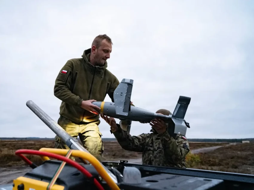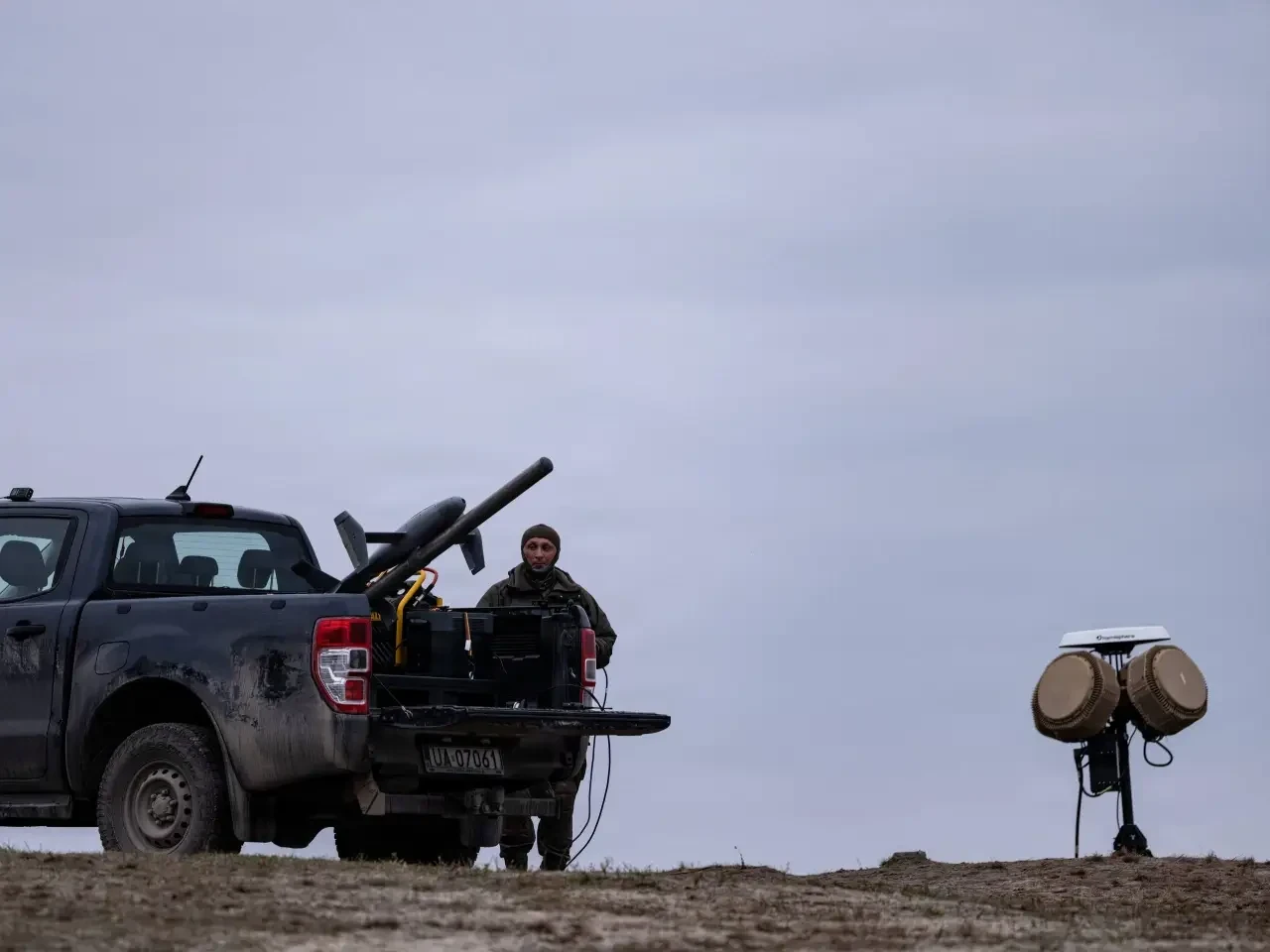 Система Merops на американо-польских учениях, ноябрь 2025 г. На автомобиле смонтирована пусковая установка с БПЛА. Рядом стоит РЛС типа MHR
