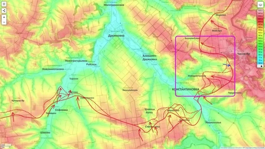 В свою очередь на Константиновском направлении продолжается операция по охвату Константиновки с юга, востока и северо-востока. На южном фасе между Ильиновкой и Долгой Балкой российские войска взяли под контроль ряд важных лесополос. Противник, осознавая угрозу окружения, отчаянно контратакует из района Новодмитровки в сторону Часова Яра.