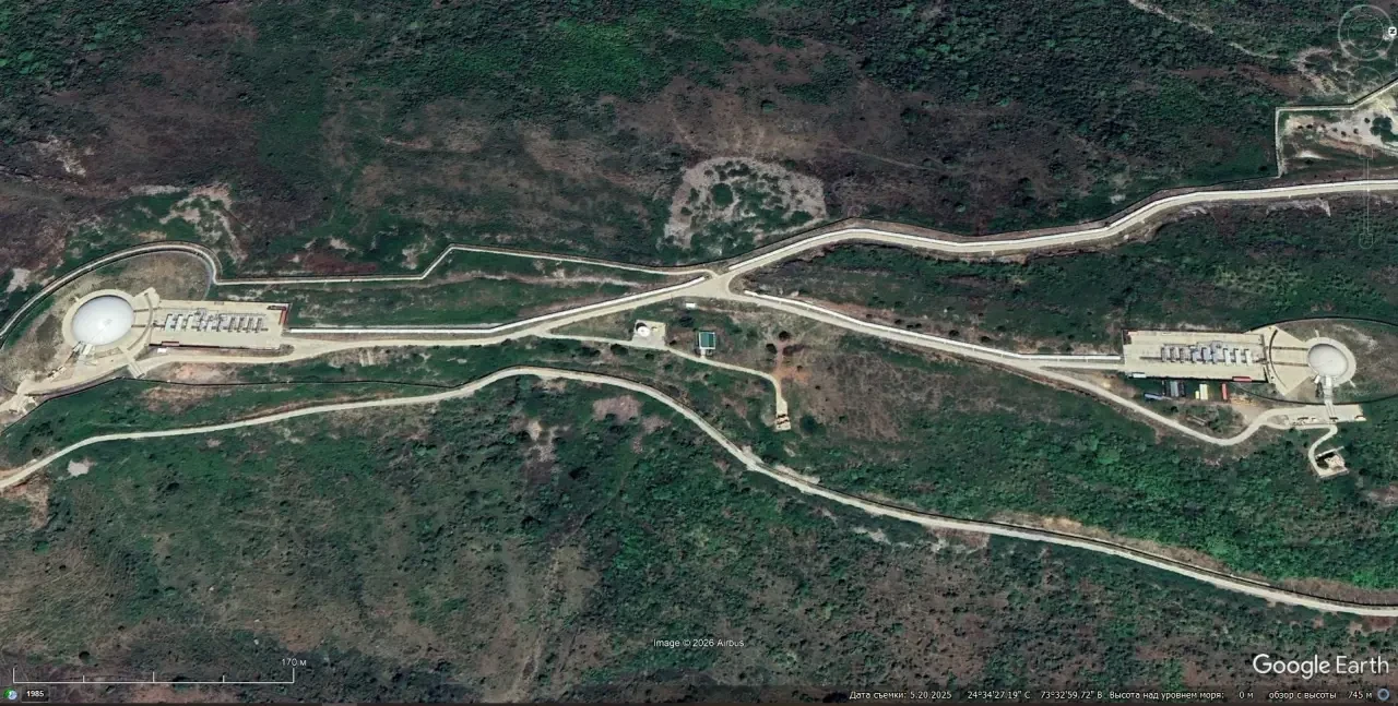 Cпутниковый cнимoк Googlе Еаrth: РЛС LRTR-I и LRTR-II на вершине горного хребта в 12 км западнее города Удайпур. Снимок сделан в мае 2025 года