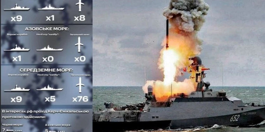 По сообщению Украины в Черном море несут боевое дежурство 9 кораблей, один из которых является носителем крылатых ракет «Калибр» с общим залпом 8 ракет, сообщает ВМС Украины.