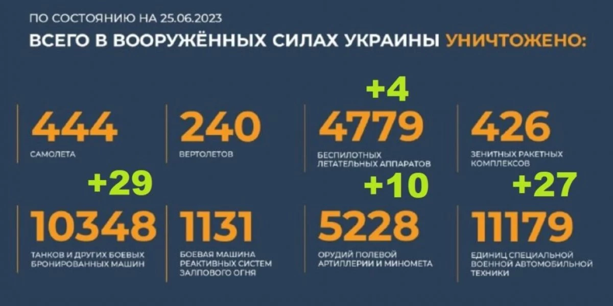 Всего с начала проведения специальной военной операции уничтожены: 444 самолета, 240 вертолетов, 4779 беспилотных летательных аппаратов, 426 зенитных ракетных комплексов, 10348 танков и других боевых бронированных машин, 1131 боевая машина реактивных систем залпового огня, 5228 орудий полевой артиллерии и минометов, а также 11179 единиц специальной военной автомобильной техники.