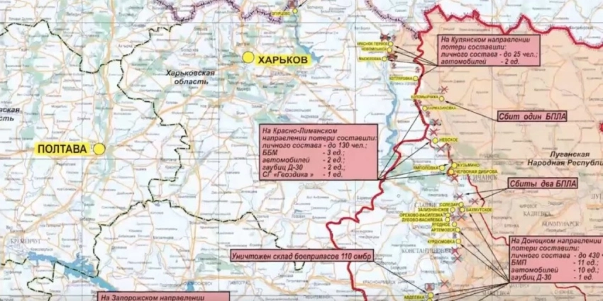 Общие потери противника за сутки на данных направлениях составили свыше 170-ти украинских военнослужащих, один танк, четыре боевые бронированные машины, три автомобиля, две гаубицы «Мста-Б», две гаубицы Д-20, а также одна Д-30.