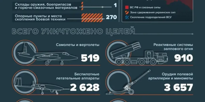 Всего с начала проведения специальной военной операции уничтожены: 339 самолетов, 180 вертолетов, 2628 беспилотных летательных аппаратов, 391 зенитный ракетный комплекс, 6996 танков и других боевых бронированных машин, 910 боевых машин реактивных систем залпового огня, 3657 орудий полевой артиллерии и минометов, а также 7477 единиц специальной военной автомобильной техники.