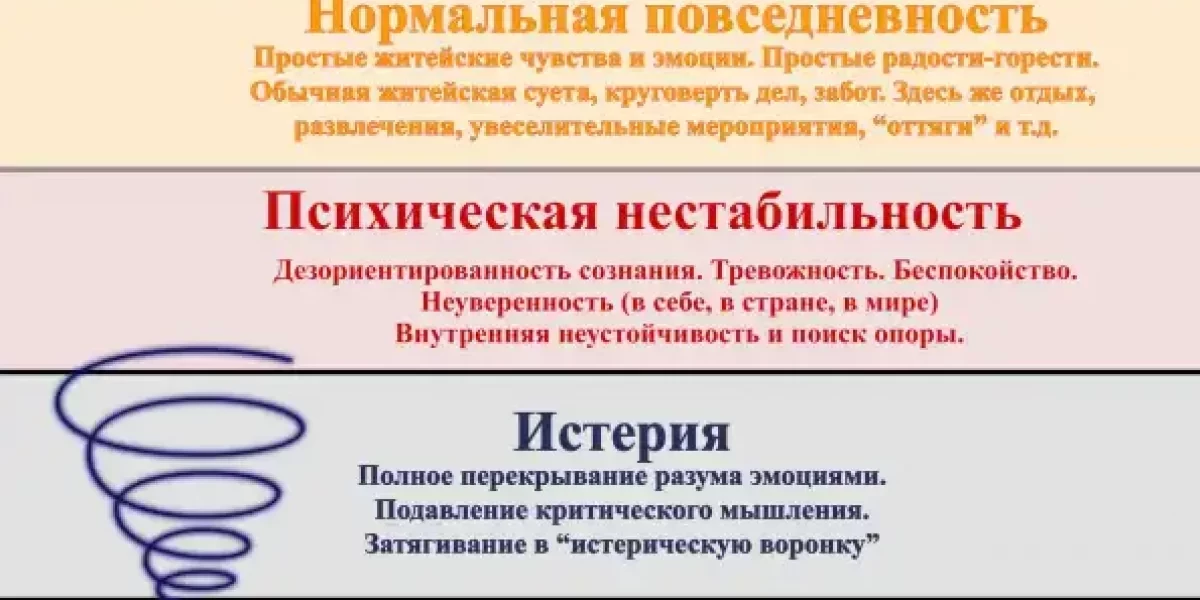Эмоциональный план такого человека моментально затягивается в истерическую воронку и потом выпадает в прострацию — как я это и рассказывал на эфире с Политверой, демонстрируя вот эту схему: