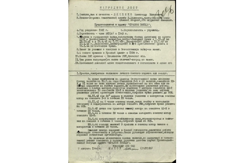 “Мои бабушка и дед по материнской линии Вера Дардаева и Александр Лященко познакомились на войне. В авиационной части, в штурмовом авиационном полку. В условиях полевых аэродромов обслуживали боевые самолеты. Обоим было чуть за 20 лет. Бабушка, к слову, добавила себе лет, чтобы ее взяли на фронт. В конце войны и поженились в части, в свидетельстве о браке стояла воинская печать. Я потом на сайте министерства обороны РФ нашел их представления к наградам и наградные листы. Их наградили медалями “За боевые заслуги”, деда представляли к ордену Красной Звезды. Читал их и понимал, что за испытания выпали на их долю… Дед, к сожалению, умер до моего рождения, вскоре после войны, последствия сказались. А бабушка не особо любила рассказывать о войне. Но вся ее трудовая жизнь так и была связана с авиацией. Работала начальником смены в аэропорту Красноярска”, — рассказывает Александр Савицкий.