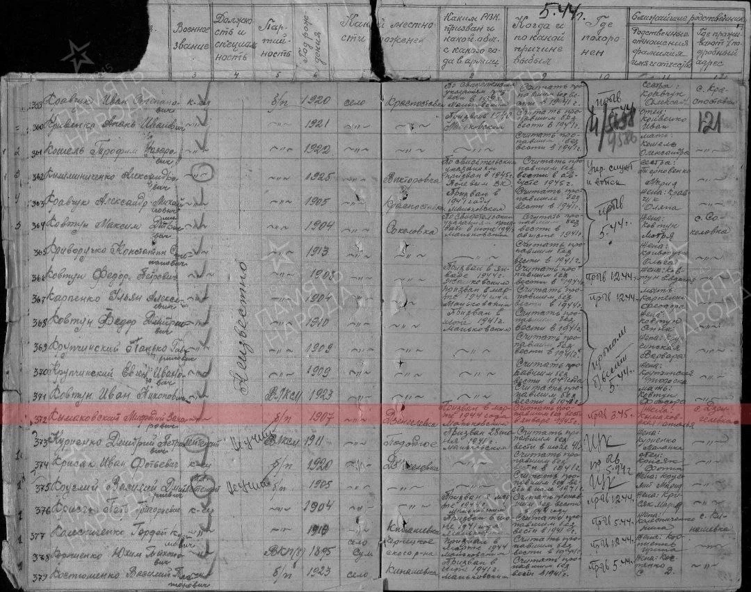 Дома прадедушка пробыл недолго. Сначала зашли немцы, прабабушка сказала, что муж болен тифом, немцы его не тронули. Через месяц зашла Красная Армия в село. Прадедушка с ними ушёл на фронт и больше не вернулся. Из документов есть только похоронка: пропал без вести в марте 1945 года.