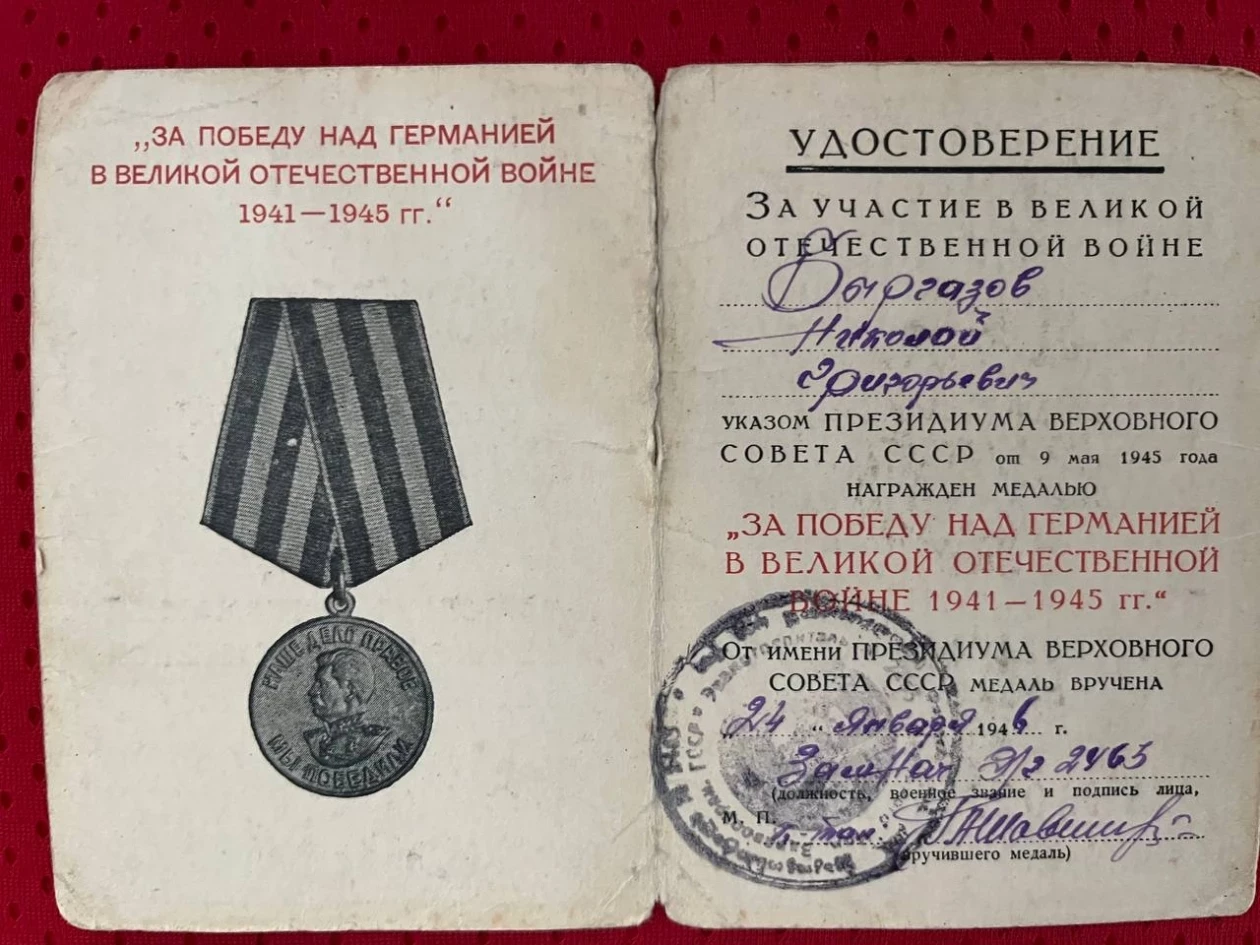 Николай Григорьевич родился в 1904 году в Иркутской области — Кировский район, деревня Быргазово. Был призван на воинскую службу в сентябре 1942 года. Служил сержантом, на войне был старшим телеграфистом. Награжден медалями “За победу над Германием в ВОВ 1941-1945” и “За боевые заслуги” и многими другими.