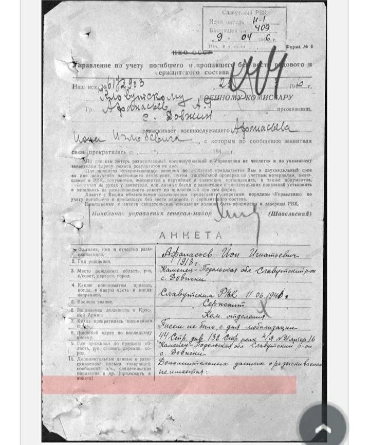 Документ о розыске пропавшего без вести Иона Афанасьева. Фото: Из личного архива А. Быргазовой