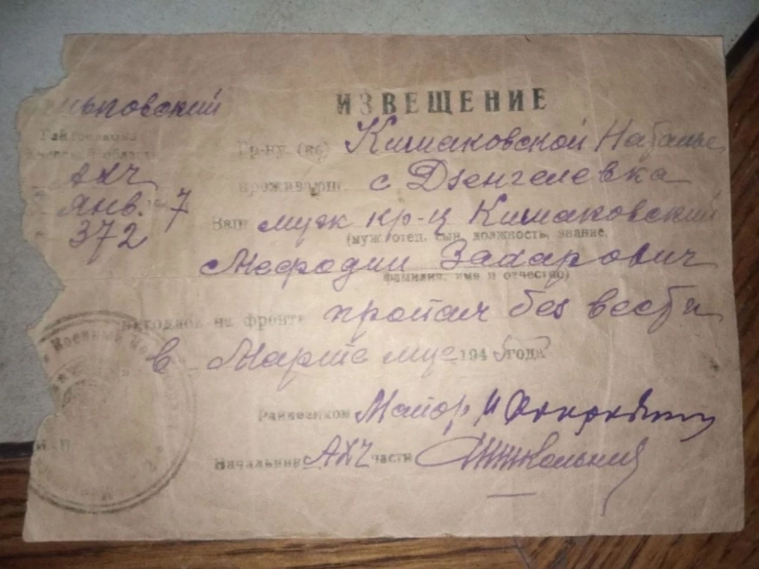 Похоронка на Кишаковского Мефодия Захаровича. Фото: Из личного архива О. Кишаковской