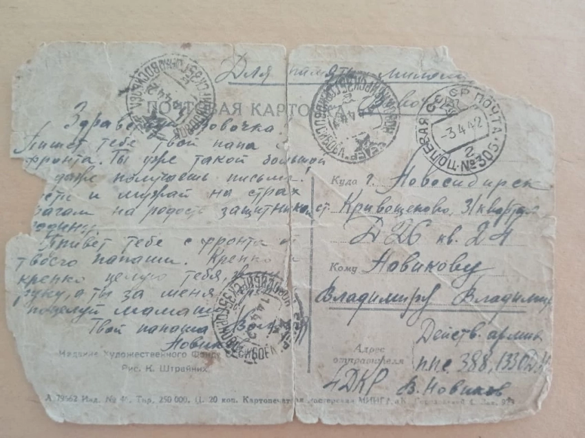 “Здравствуй, Вовочка! Пишет тебе твой папа с фронта. Ты уже такой большой, что даже получаешь письма! Расти и мужай на страх врагам, на радость защитникам Родины. Привет тебе с фронта от твоего папаши. Крепко-крепко целую тебя, жму руку, а ты за меня крепко поцелуй мамашу!”, — написал в своем последнем письме Владимир Новиков.
