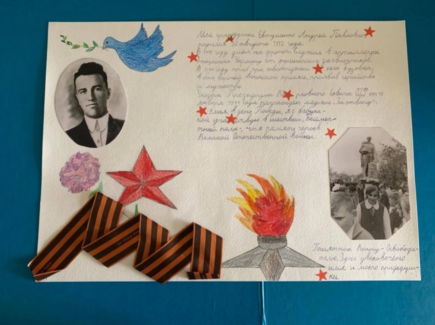 Память о герое хранят его дети, внуки и правнуки. Так выполнил творческую работу о своем прадеде племянник Светланы Куликовой:
