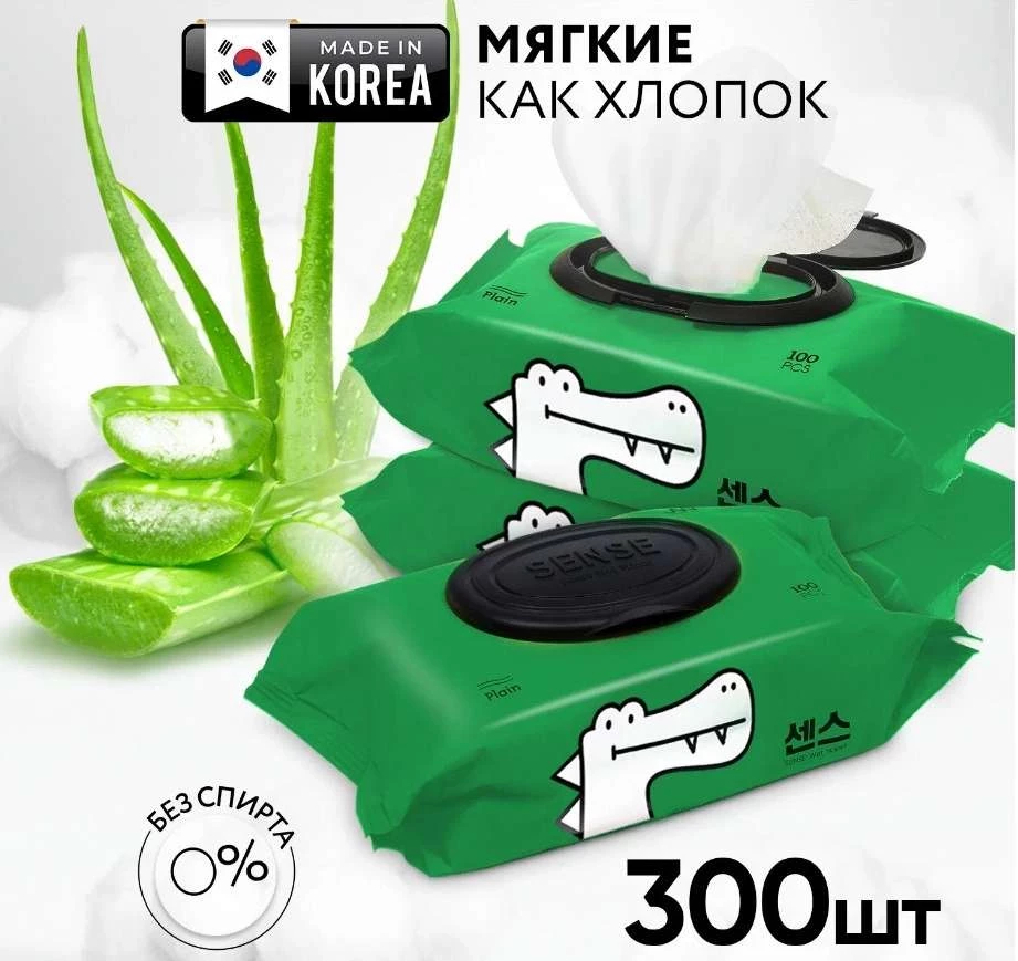 SENSE Влажные салфетки с клапаном и алоэ вера без спирта 300 шт