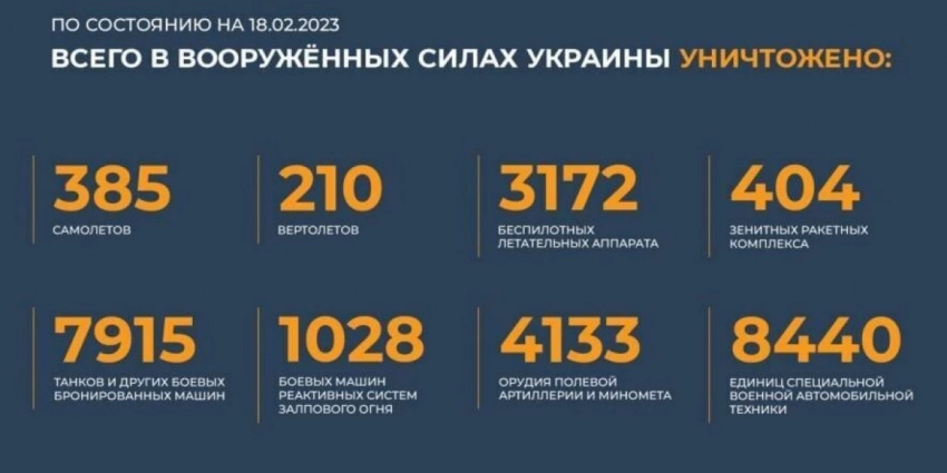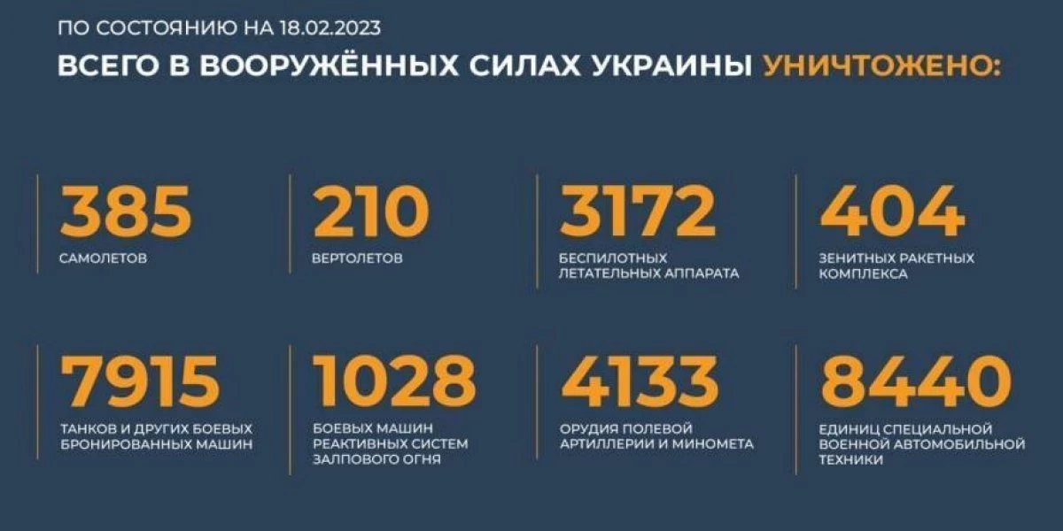 - Всего с начала проведения специальной военной операции уничтожены: 385 самолетов, 210 вертолетов, 3172 беспилотных летательных аппарата, 404 зенитных ракетных комплекса, 7915 танков и других боевых бронированных машин, 1028 боевых машин реактивных систем залпового огня, 4133 орудия полевой артиллерии и миномета, а также 8440 единиц специальной военной автомобильной техники.