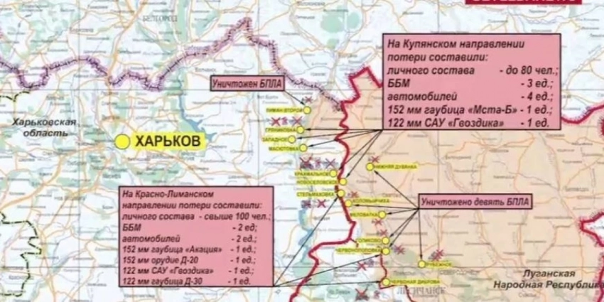 - На Купянском направлении в результате наступательных действий подразделений Западной группировки войск полностью освобожден населенный пункт Гряниковка Харьковской области. Кроме того, ударами штурмовой и армейской авиации, огнем артиллерии нанесено поражение живой силе и технике противника в районах населенных пунктов Новоселовское Луганской Народной Республики, Западное, Масютовка и Крахмальное Харьковской области. Потери ВСУ на данном направлении составили до 80 военнослужащих, три боевые бронированные машины, четыре автомобиля, гаубица «Мста-Б» и самоходная гаубица «Гвоздика».