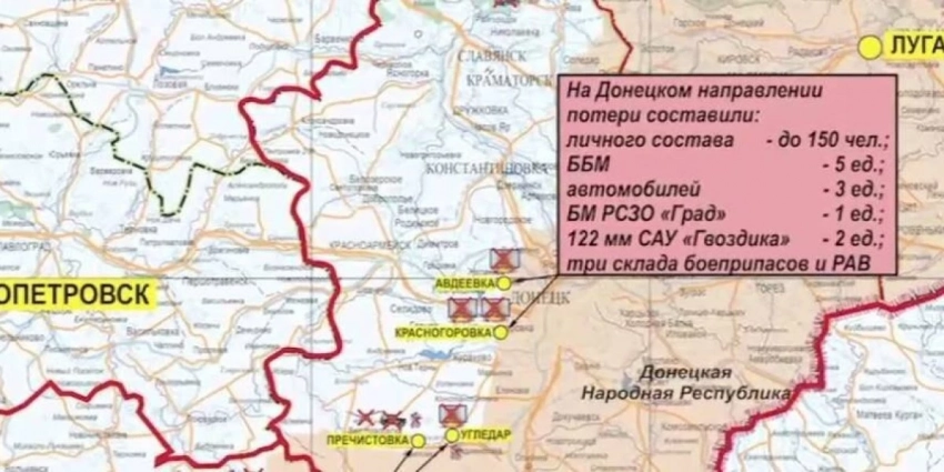 - На Донецком направлении при поддержке ударов штурмовой и армейской авиации, огня артиллерии, продолжено наступление подразделений Южной группировки войск. За сутки уничтожено до 150 украинских военнослужащих, пять боевых бронированных машин, три автомобиля, боевая машина РСЗО «Град» и самоходная гаубица «Гвоздика». Также в районах населенных пунктов Авдеевка и Красногоровка Донецкой Народной Республики уничтожены три склада боеприпасов и ракетно-артиллерийского вооружения ВСУ.
