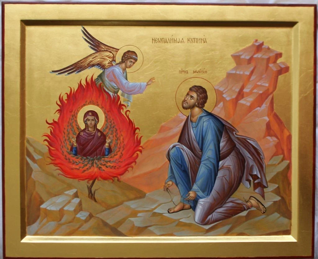 В купине, огнем горящей и несгараемей, / показавый Моисеови Пречистую Твою Матерь, Христе Боже, / огнь Божества неопальне во чреве приимшую / и нетленну по Рождестве Пребывшую. / Тоя молитвами от пламене страстей избави нас / и от огненных запалений град Твой сохрани, // яко Многомилостив.