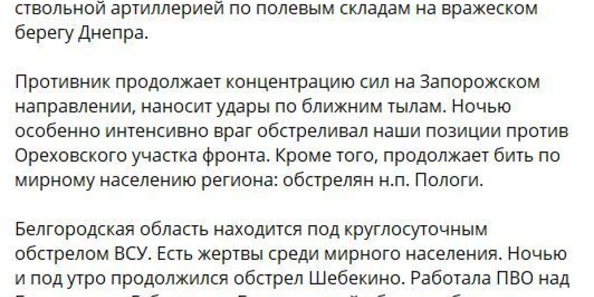По информации МО РФ, за сутки на Запорожском направлении под удар попали позиции ВСУ в районах Малой Токмачки и Щербаков. В районе Горького поражен командно-наблюдательный пункт украинской теробороны. У Новоандреевки сбит Су-25 ВВС противника.