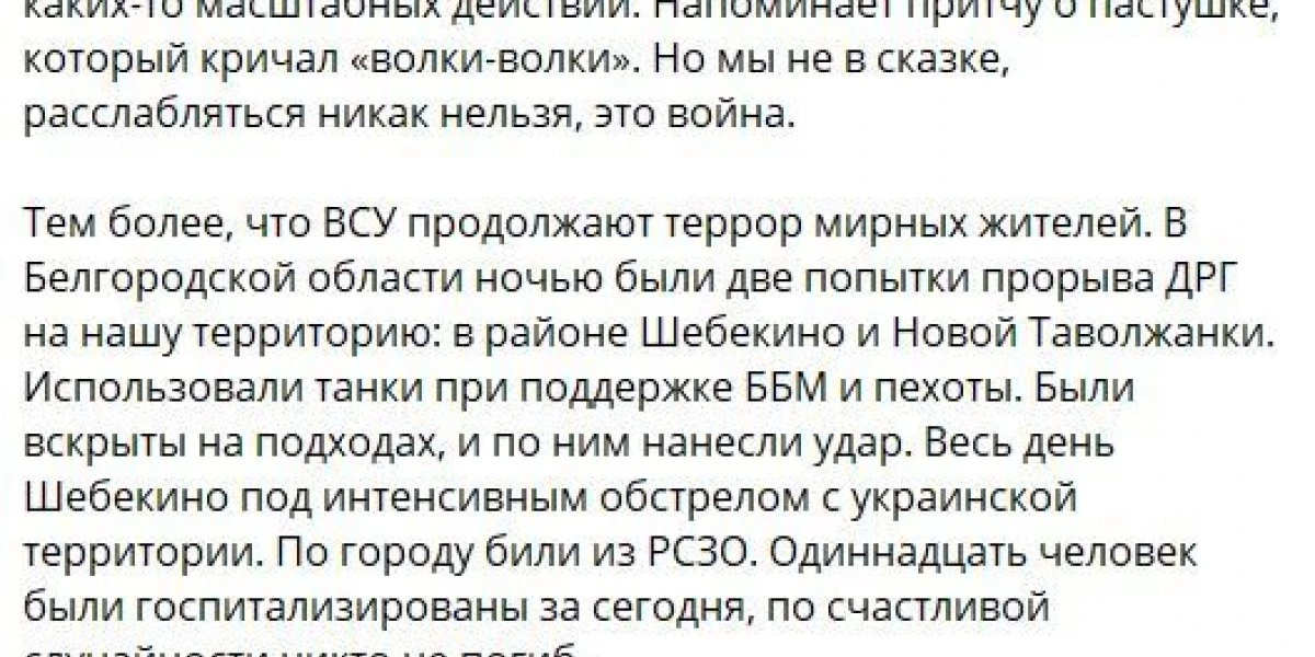 Как сообщило Минобороны, в ночь на 1 июня украинские формирования в районе пункта автомобильного пропуска «Шебекино» попытались прорваться через границы силами до двух мотопехотных рот при поддержке танков. По официальной информации, атака была отбита, они отступили, потеряв часть бронемашин.