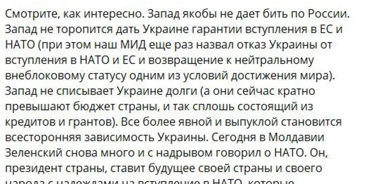 «Перемирие они захотят только тогда, когда ВСУ будет на грани разгрома. В этот самый момент они скажут: «ну вы же тогда говорили что-то про мирные договоренности». Но, скорее всего, будет предложено не завершить конфликт, а остановить его, заморозить, как мы видели это во всех этих «Минсках». То есть они захотят перегруппироваться, накопить силы и подготовиться к новому удару», — добавил политолог.