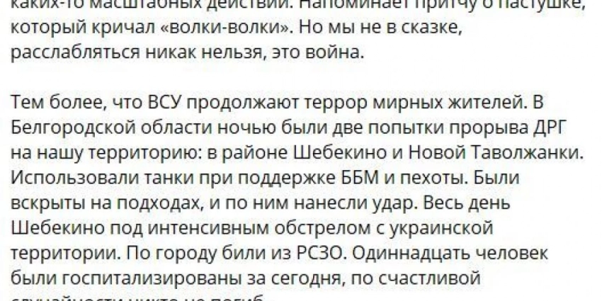 Украинские войска продолжают обстреливать населенный пункт Шебекино в Белгородской области. В результате атак за четверг были госпитализированы не менее 11 человек, 4 находятся в реанимации в тяжелом состоянии. Кроме того, в МО России заявили, что в ночь на четверг группа из более чем 50 украинских боевиков была уничтожена при попытке прорваться на территорию Белгородской области.