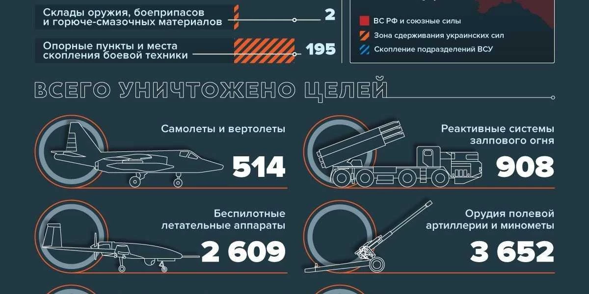 Всего с начала СВО, по данным Минобороны РФ, уничтожены 7450 единиц специальной военной автомобильной техники противника, 6970 танков и других боевых бронированных машин, 3652 орудия полевой артиллерии и минометов, 2609 БПЛА, 908 боевых машин РСЗО, 391 ЗРК, 336 самолетов и 178 вертолетов Вооруженных сил Украины. Источник