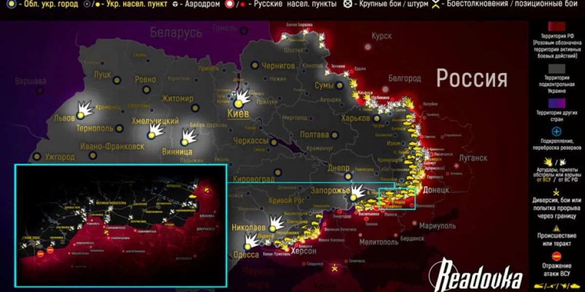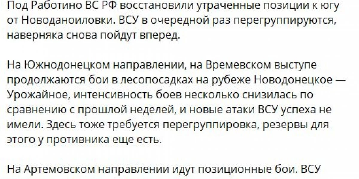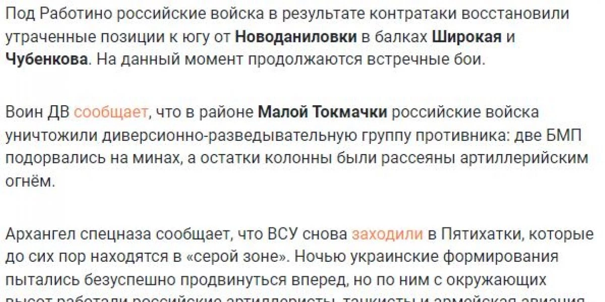 Запорожское направление: не прекращаются бои за Пятихатки, пока в нашу пользу, к тому же немного пополнился обменный фонд. Тем временем ВСУ продолжают концентрировать силы на Ореховском участке. Также российские бойцы вернули позиции в районе Работино. На Времьевском выступе идут бои в окрестностях Урожайного.