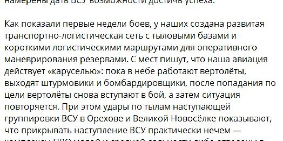 Контрнаступление ВСУ, начавшееся, по словам президента РФ Владимира Путина, 4 июня, до сих пор не принесло киевскому режиму желаемых результатов. Полковник в отставке и военный обозреватель Виктор Литовкин отметил, что ключевой ошибкой ВСУ в рамках контрнаступления стало начало активных действий без преимущества в воздухе и отсутствия ударных вертолетов, штурмовиков и бомбардировщиков.