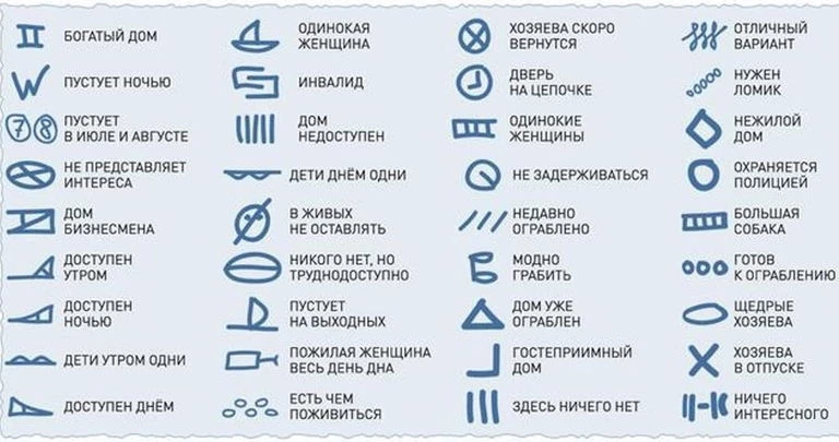 Воровское братство обладает не только своим сленгом, но и тайным языком знаков, доступным только внутри этого «профессионального» сообщества. Опытные «разведчики» выискивают потенциальные цели и оставляют тонкие метки, предостерегая своих сообщников.