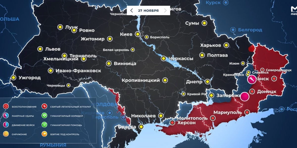 Обстановка на Донбассе и Украине на сегодняшний день, 28 ноября, карта боевых действий и продвижения войск РФ, последний брифинг Минобороны, свежие видео-сводки от Юрия Подоляки, Игоря Конашенкова и Михаила Онуфриенко — собрали актуальные новости по Украине.
