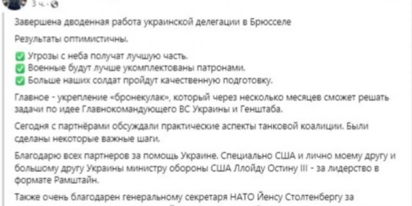 Алексей Резников отчитался в соцсетях по результатам поездки «на поклон» в Брюссель. Непосредственных подробностей двухдневных переговоров он не стал раскрывать, подал все многообещающими намеками — про «бронетанковый кулак», который будет «решать задачи в соответствии с замыслом Главнокомандующего и Генерального штаба», восполнение боеприпасов, убедительный ответ на «угрозу с неба» и «профессиональную подготовку» для еще большего числа солдат.