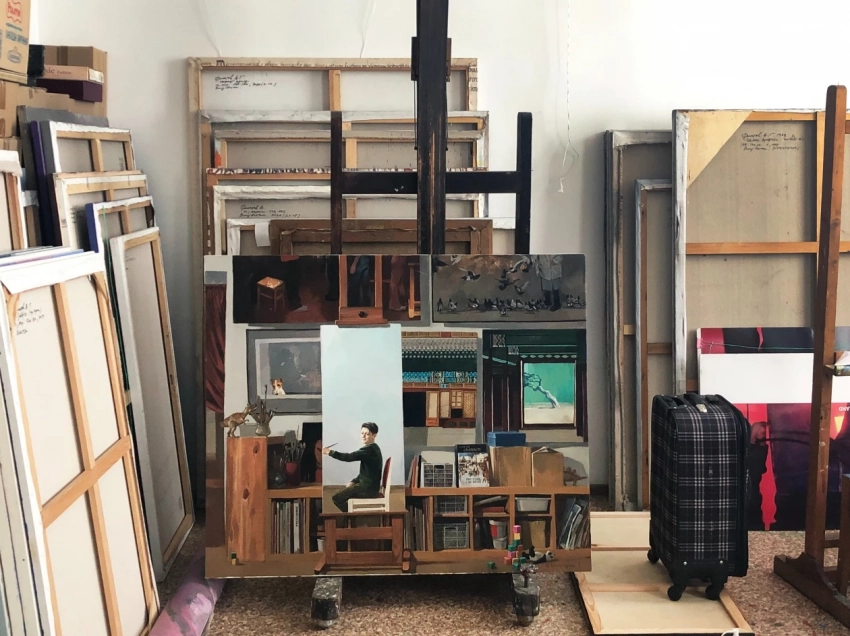 Картина Марии Холмогоровой на мольберте Кирилла Шебеко в мастерской. Фото: филиал Третьяковской галереи во Владивостоке