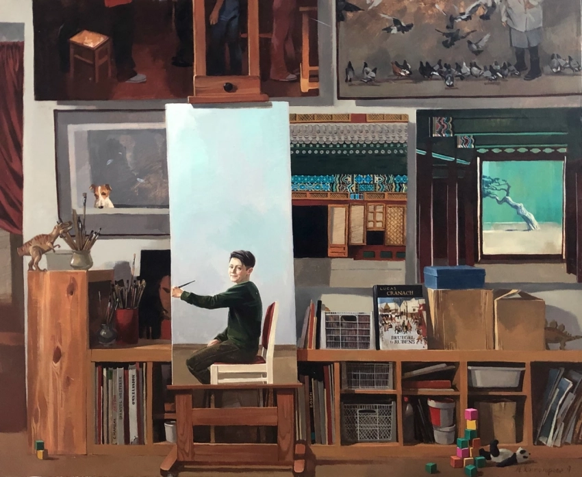 Слева от картины “Чукотка” в мастерской расположен автопортрет 2000-х годов. Кирилл Шебеко работал в той же технике. Он изобразил себя во время работы.