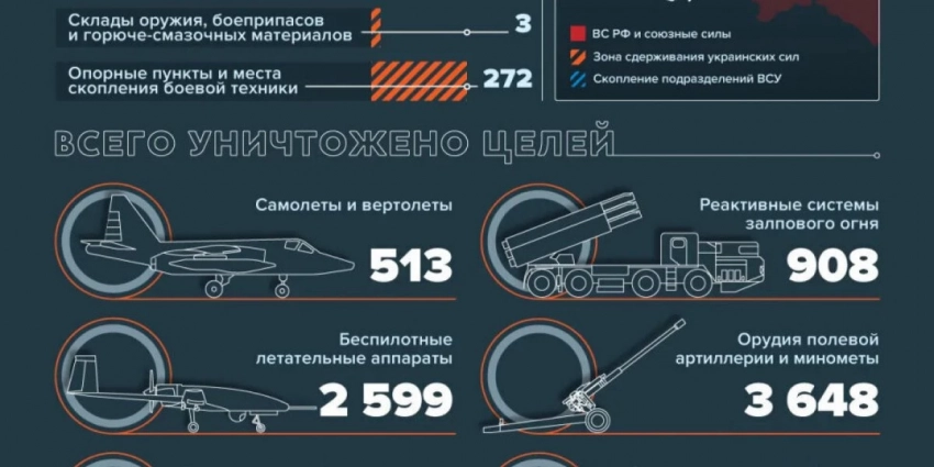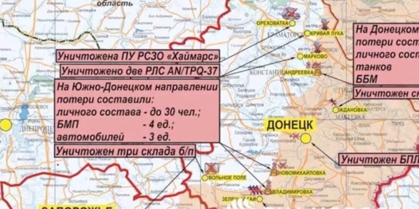 Тем временем артиллерия и авиация поразили пункты управления ВСУ в Диброве, Водяном, Пречистовке, Константиновке. В населенном пункте Часов Яр уничтожено расположение иностранных наемников. Также над Украинкой сбит МиГ-29 ВВС Украины, а над Никольским — Су-25.