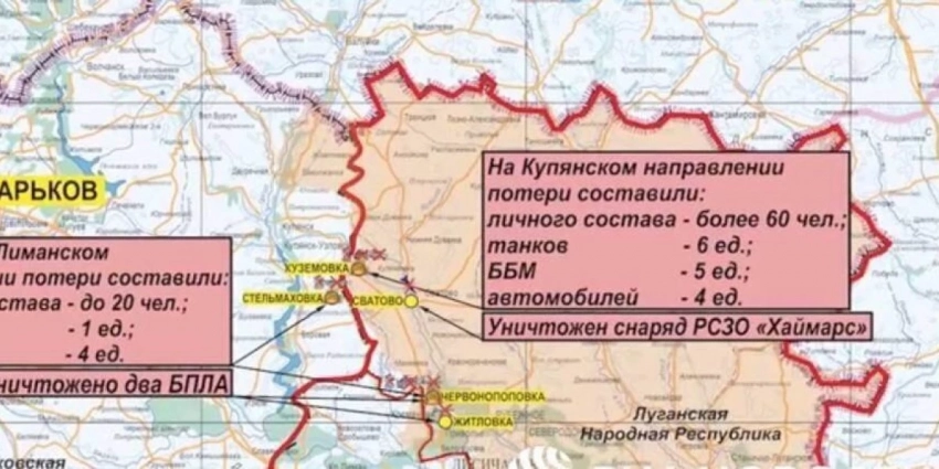 Российской армией, при поддержке армейской авиации и тяжелых огнеметных систем была пресечена атака боевиков в направлении Котляровки Харьковской области. ВСУ потеряли два танка, четыре БМП и два бронеавтомобиля «Козак». Также пресечена попытка врага атаковать Червонопоповку ЛНР, враг понес огромные потери: более 100 убитыми и ранеными, два танка, две бронемашины, а также 11 боевиков сдались в плен.