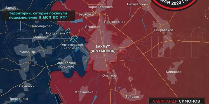- Подразделения 9 мотострелкового полка ВС РФ оставили лесополосу и укрепрайон, отойдя в северном направлении на глубину 600 метров, тем самым снова открыв ВСУ дорогу Часов Яр — Бахмут.