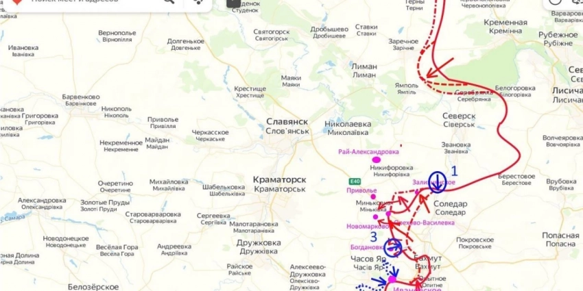 Причем, противник применяет пока тактику растаскивания наших резервов (перед главным ударом) для чего он поочередно бьет короткими ударами вначале на севере со стороны Северска (1), затем с юга, южнее Ивановского (2), а сегодня в центре в районе Богдановки (3).