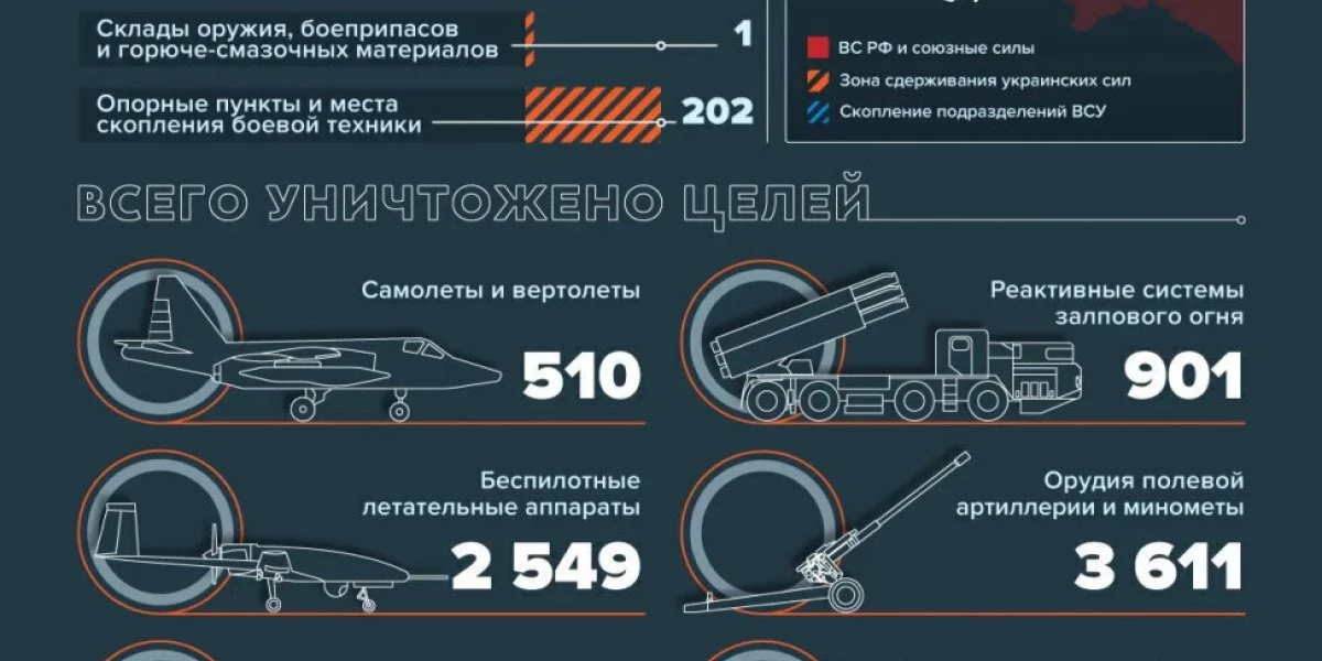 ? Оперативно-тактической и армейской авиацией, ракетными войсками и артиллерией поражены 11 пунктов управления ВСУ в районах населенных пунктов Чугуев, Кисловка, Крахмальное, Берестовое, Кругляковка Харьковской области, Победа, Доброволье, Водяное Донецкой Народной Республики, Садовое, Токаревка, Дудчаны Херсонской области, а также 63 артиллерийских подразделения на огневых позициях, живая сила и военная техника в 136-ти районах.